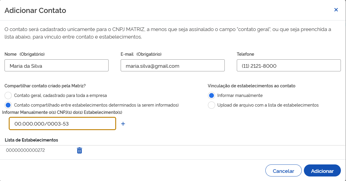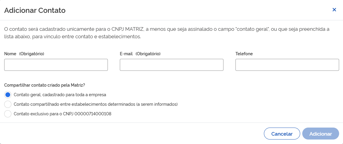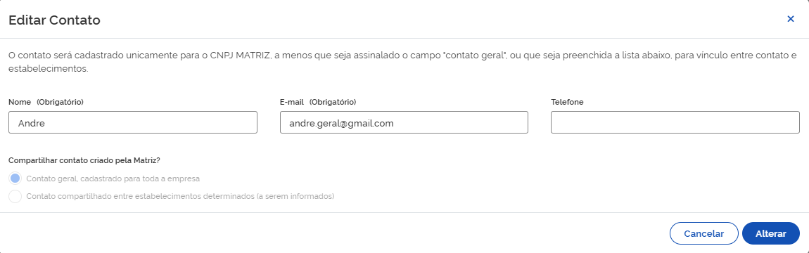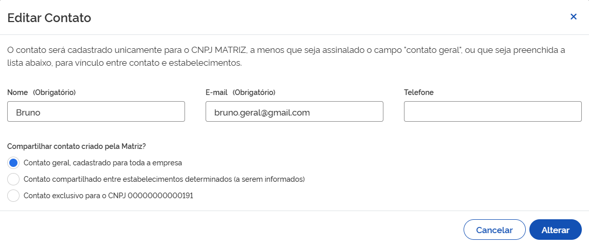 Nesse caso, o Contato será compartilhado em cada CNPJ que a empresa possuir.