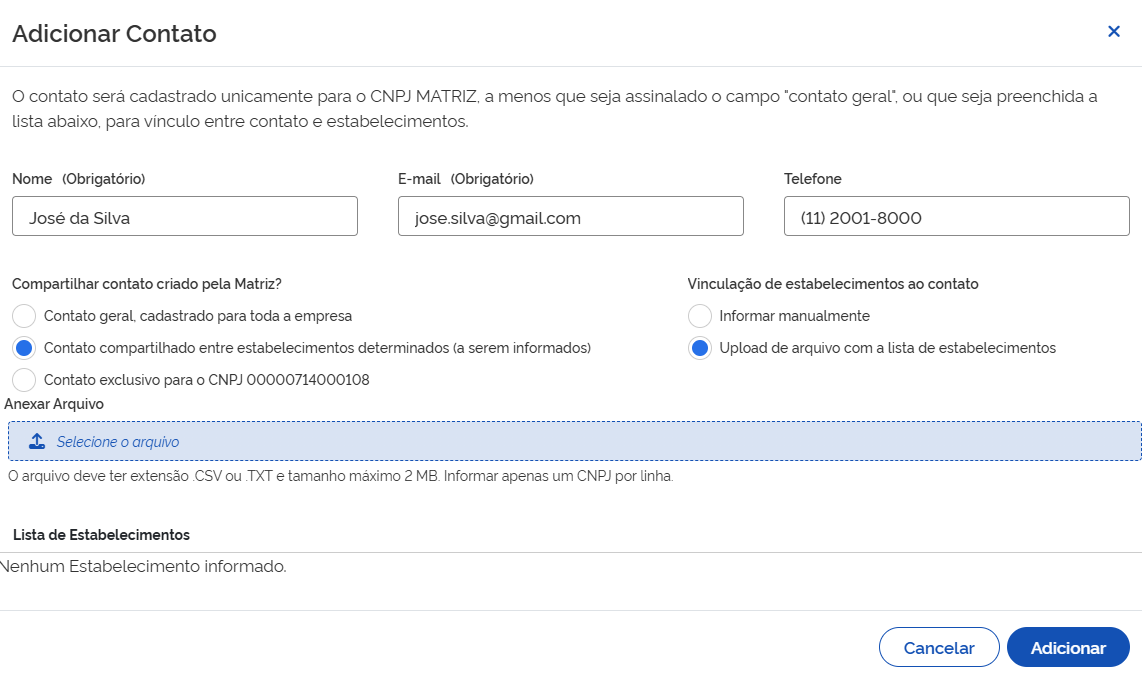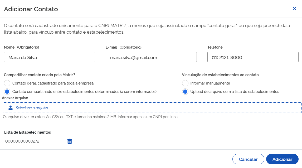 Aqui, por sua vez, o contato será compartilhado apenas em cada CNPJ que for especificado. Essa informação poderá ser manual ou através de planilha.