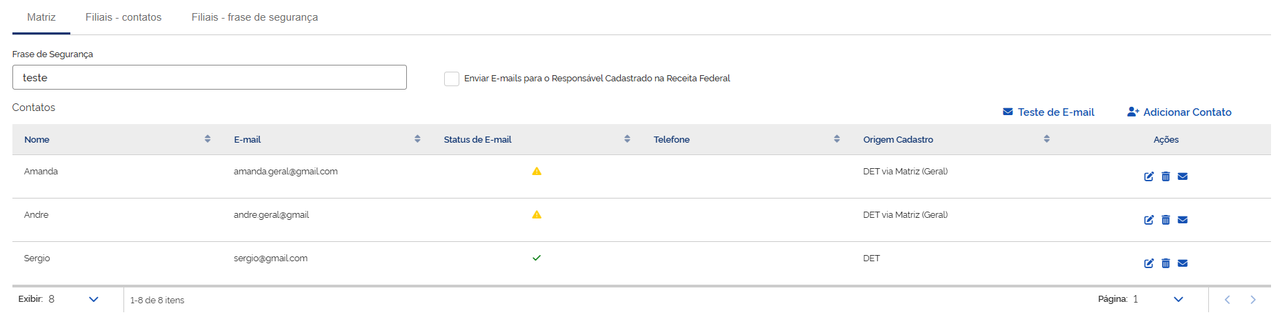 nesta aba é possível adicionar, editar ou excluir contatos da Matriz e testar cada e-mail de forma individual ou de todos ao mesmo tempo.