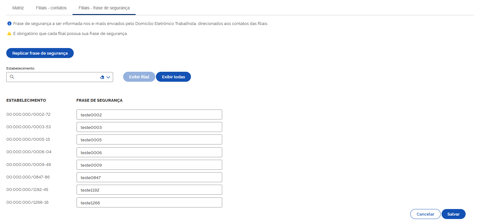 Nessa seção é possível replicar a mesma Frase de Segurança em todas as Filiais ou individualizar cada uma delas, o que é o ideal para saber referente a qual, além do CNPJ, a mensagem no DET é destinada.