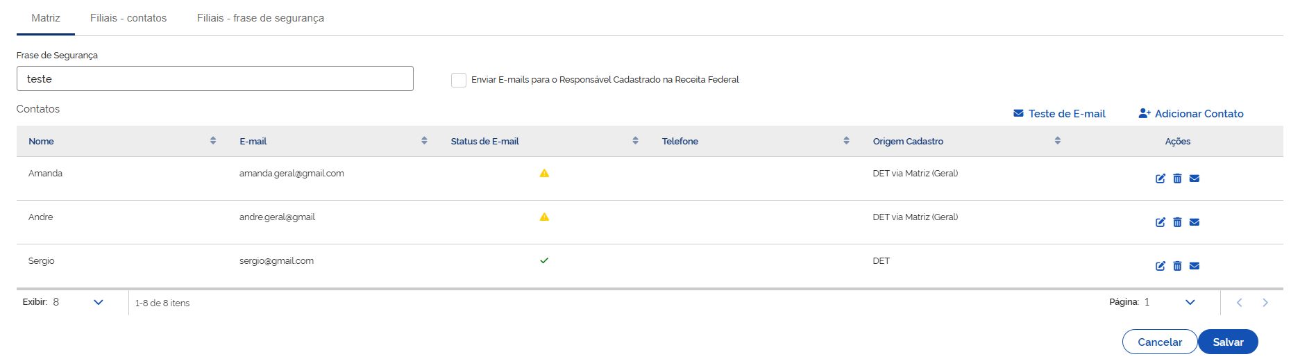 Clique (abaixo da tabela de Contatos) em Salvar, para confirmar, ou em Cancelar, para descartar.
